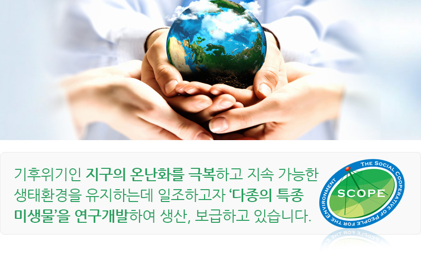 저희 ‘SCOPE(환경인 사회적협동조합)’로 자연환경 보호를 위한 연구 개발을 통하여 자연과 동물의 생태 환경을 회복시키는 것이 결국 널리 사람을 이롭게 하는 지름길이라는 것을 깨닫고, 홍익인간(弘益人間)의 정신을 회사의 사명으로 삼아 꾸준히 연구하고 개발하여 기후위기인 지구의 온난화를 극복하고 지속 가능한 생태환경을 유지하는데 일조하고자 ‘다종의 특종 미생물’을 연구개발하여 생산, 보급하고 있습니다.